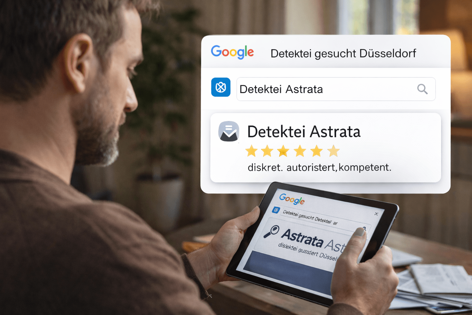Ein Nutzer, der auf die Detektei Agentur Astrata aufmerksam wird, prüft zunächst die auf der Webseite angebotenen Fachgebiete – so wie er es auch bei anderen Ermittlungsagenturen in NRW getan hat. Um die Auswahl zu erleichtern, entscheidet er sich anschließend, die KI-Suche von Google zu Rate zu ziehen.